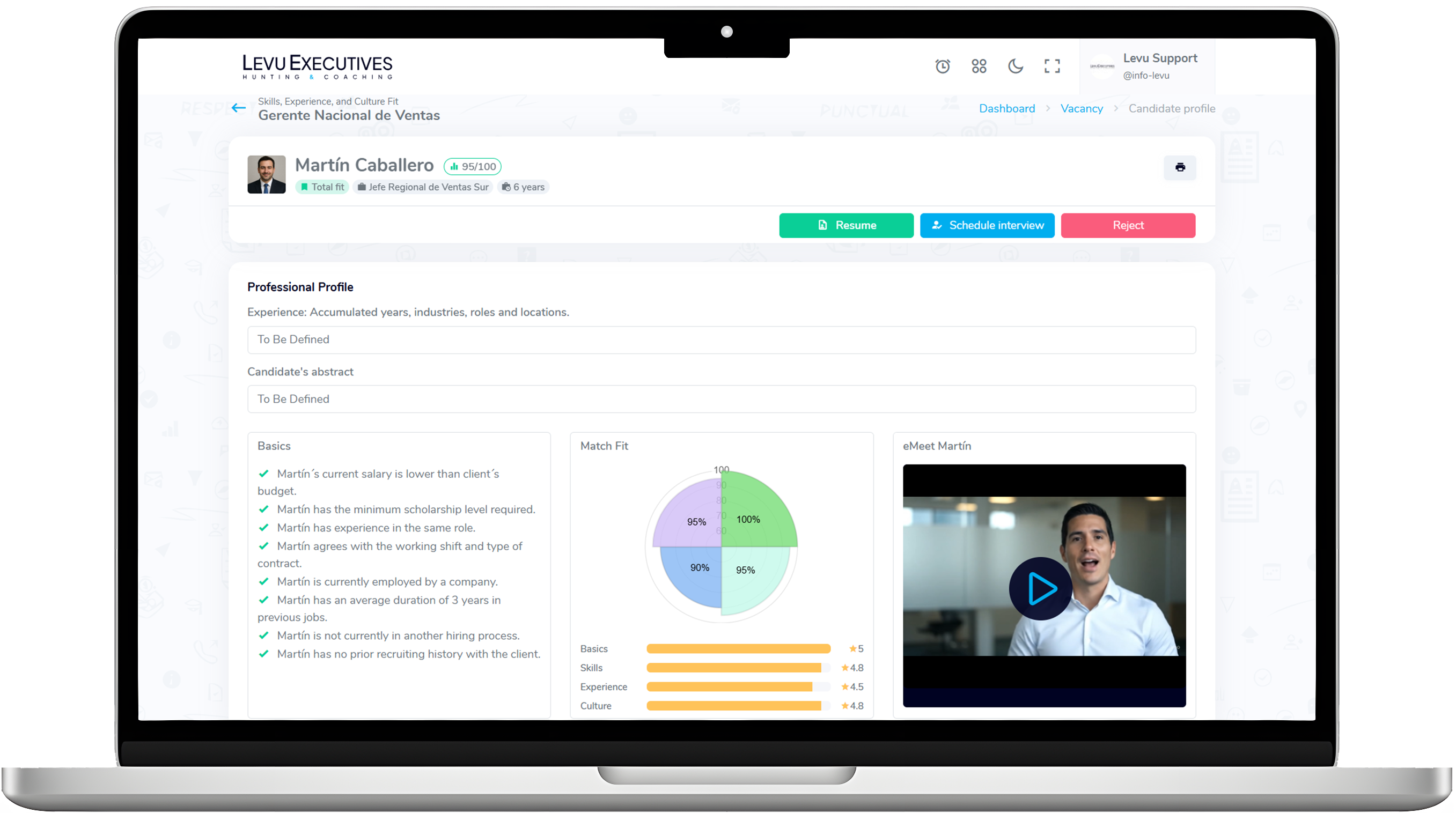 The second is our web app, Levu Dashboard, a platform designed to make it easier for our clients to analyze and understand candidates. Through Levu Dashboard, we provide all the necessary information to thoroughly and succinctly understand the profile of each candidate.